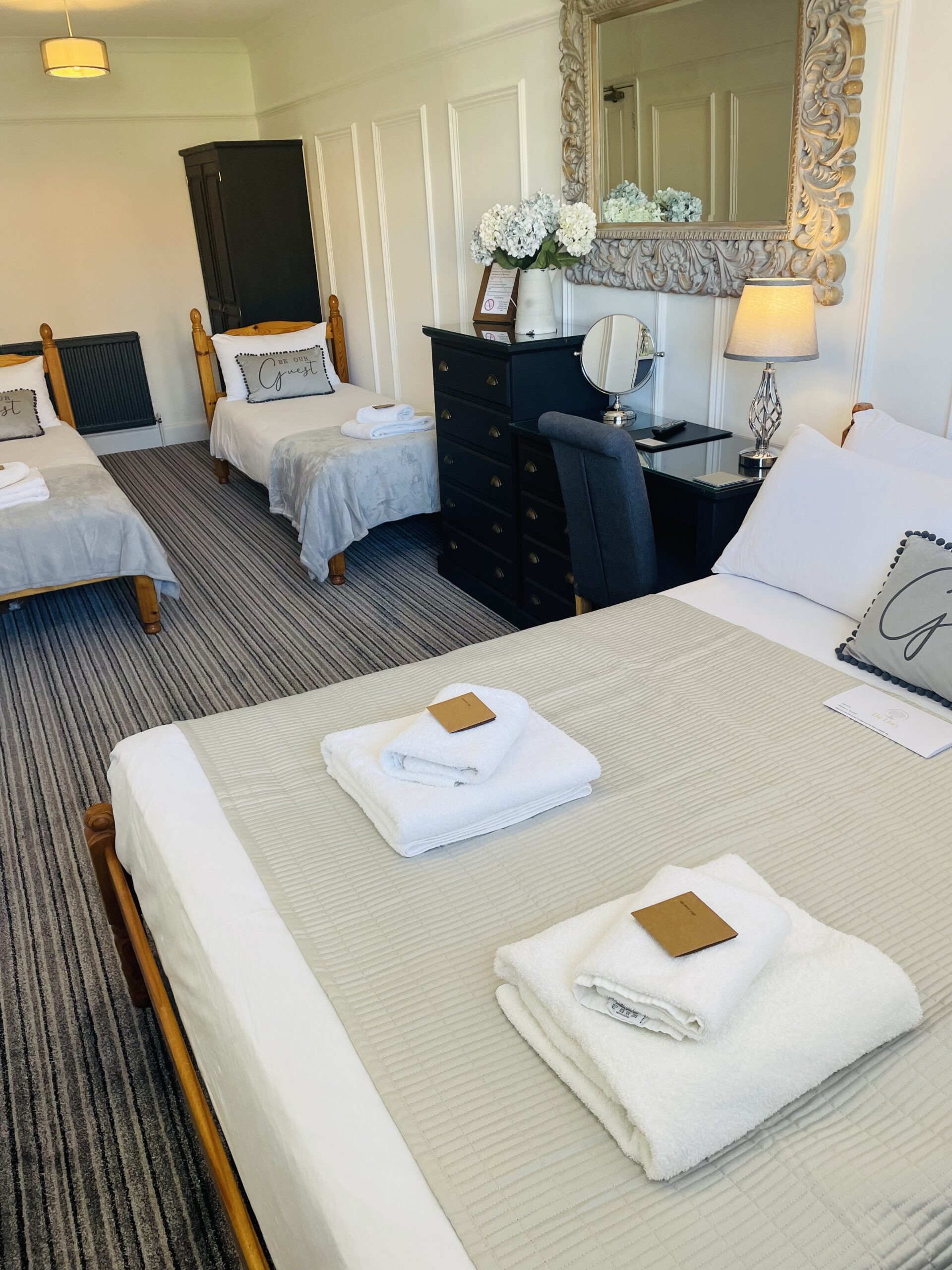 Features include a dressing table, hair dryer, Freeview T.V, tea & coffee making facilities, an alarm clock, wardrobe, and bedside tables.
